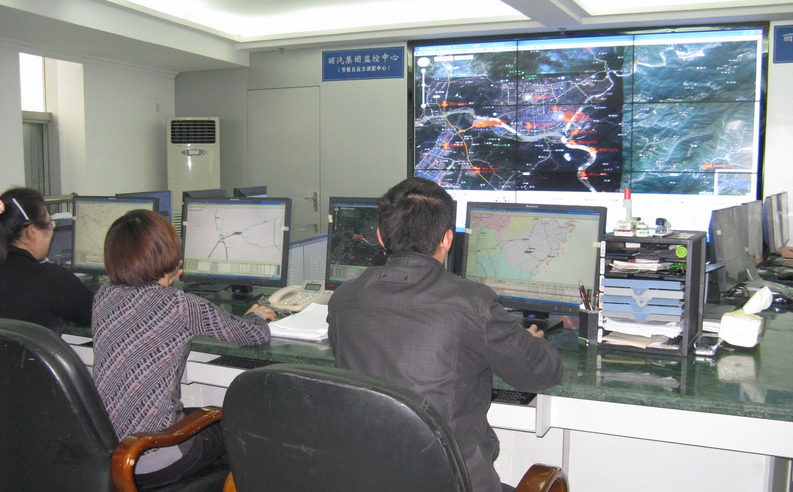麗汽集團的工作人員在GPS系統監控室監控所屬的180多輛營運客運車輛運行狀況。