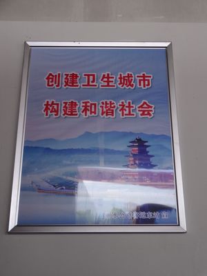 現(xiàn)在,墻上懸掛的是創(chuàng)衛(wèi)口號(hào)與麗水山水風(fēng)光相結(jié)合的宣傳畫,賞心悅目。