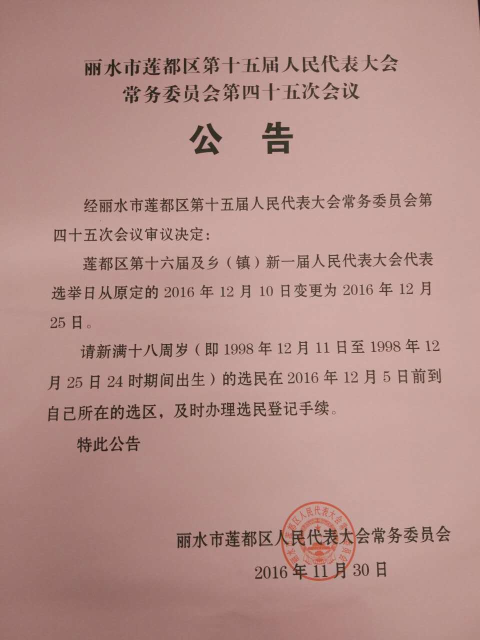 蓮都區人大常委會關于變更選舉日期的公告