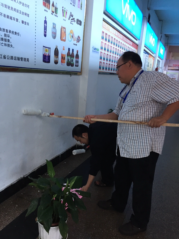 東站志愿者隊售票廳、候車廳、發車區墻壁進行刷白