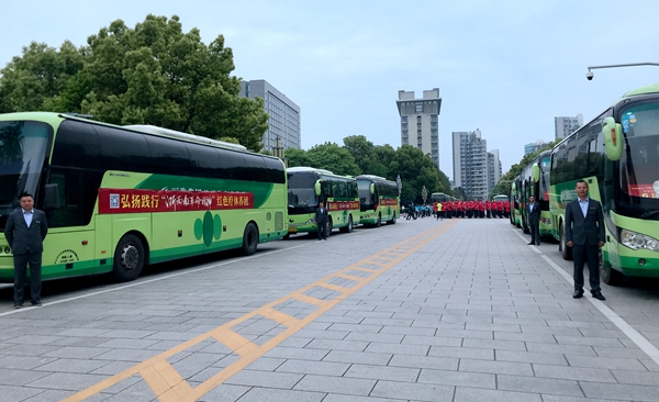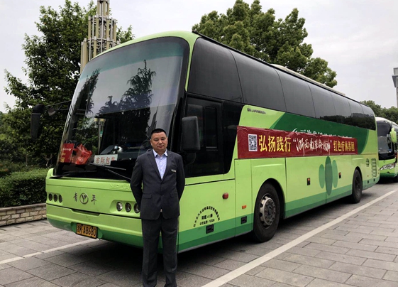 4月19日早上,在市政府南門廣場,麗汽集團旅游汽車分公司16輛綠色豪華大巴齊刷刷地排列著,16位駕駛員統一著裝,整齊劃一地站在車門迎候游客。這是2019年麗水市弘揚踐行“浙西南革命精神”系列活動啟動儀式暨勞模、一線(優秀)職工紅色療休養活動發團儀式的現場。綠色大巴與著紅色服裝的先進相互映襯,形成了“紅+綠”融合發展的場景,和諧的畫面吸引了在場人員的關注,紛紛拿出手機拍場景,曬朋友圈。