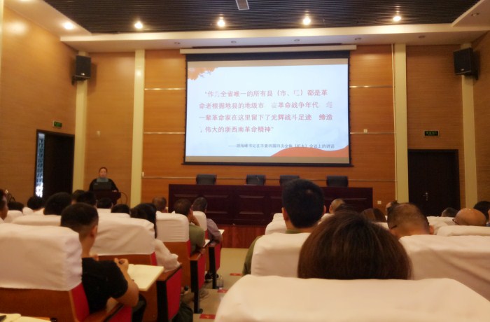 市委黨史研究室、市地方志辦公室主任雷華英從浙西南革命精神的歷史概況、內涵和解讀、弘揚踐行浙西南革命精神三個方面授課。在革命戰(zhàn)爭年代,老一輩革命家在麗水所有的縣市區(qū)都留下了光輝戰(zhàn)斗足跡,締造了偉大的“浙西南革命精神”。周恩來同志在麗水的抗戰(zhàn)史;粟裕、劉英同志帶領中國工農紅軍挺進師,與麗水人民一道浴血奮戰(zhàn),團結一心干革命,播撒了開啟光明的寶貴革命火種。直至如今,偉大精神已深深融入麗水大地,流淌在處州兒女的血脈中,成為激勵一代又一代麗水人堅定理想信念、戰(zhàn)勝一切困難、奪取前進道路上一個又一個勝利的力量源泉。