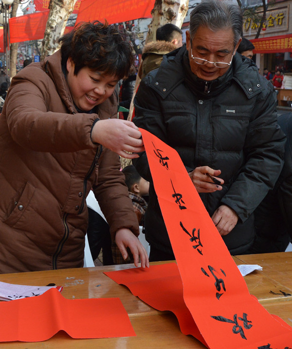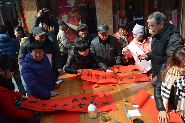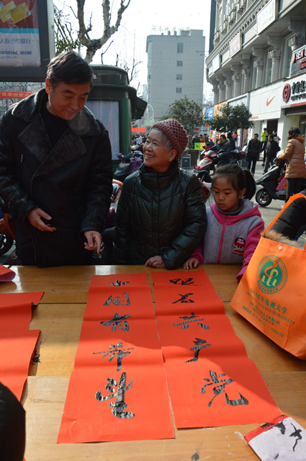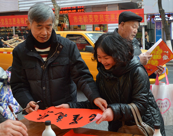 幾張小桌子拼成的簡易書案更是黨員一條街上靚麗的風景。三位老同志一落筆,書案旁邊一下子就圍滿了人,大家一邊排隊等候著“墨寶”,一邊點贊著三位老師的書法。葉女士高興地說:“手寫的春聯不僅更有年味,而且還是在弘揚中國的書法藝術。中國傳統的年俗文化,現在已經越來越難得了?!币粚﹄p胞胎寶寶的父母恰巧推著嬰兒車從服務點前經過,趕緊請老師寫下“開心寶貝”四個字,還說是給孩子倆最珍貴的新年禮物。
