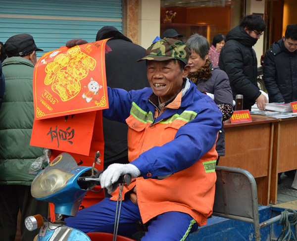 環衛工人接過麗汽集團黨員送上的福字和春聯臉上樂開了花