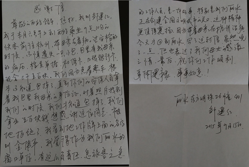 盡快送回“救命錢”,對金偉平來說,是做好本職工作,但對鄒女士母女來說,卻也猶如雪中送炭,正如鄒女士在信中寫道,“作為我們麗水的窗口單位(客運西站),有這樣負責任,急旅客之急的工作人員,是一件好事,特別是我們麗水正在創建全國文明城市的關口,這種精神更值得表揚。”