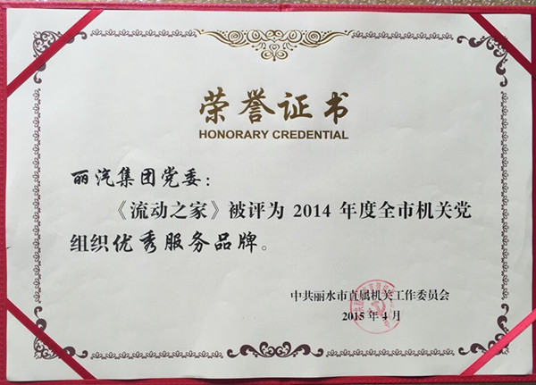 近日,麗汽集團“流動之家”服務品牌在中共麗水市直屬機關工作委員會開展的2014年度全市機關黨組織優秀學習品牌、優秀服務品牌評選活動中,喜獲“2014年度全市機關黨組織優秀服務品牌”稱號。